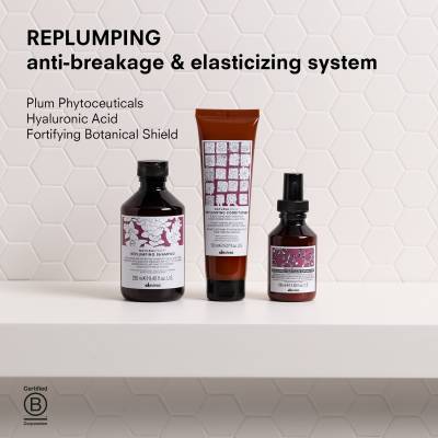 After shampooing with Replumping Shampoo, eliminate excess water and apply product to lengths and ends. Leave on for 2-3 minutes, then comb through. Rinse off thoroughly.